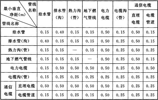 注:1 表中管道、電纜和電纜溝最小垂直凈距,系指下面管道或管溝的外頂與上面管道的管底或管溝基礎(chǔ)底之間的凈距。