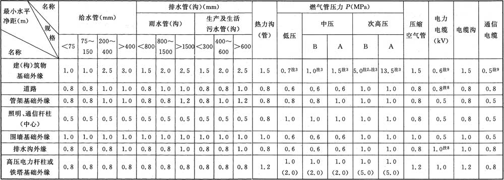 注:1 表列凈距除注明者外,管線均自管壁、溝壁或防護(hù)設(shè)施的外緣或最外一根電纜算起;道路為城市型時(shí),自路面邊緣算起,為公路型時(shí),自路肩邊緣算起。