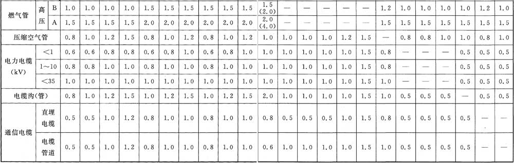 2 當(dāng)熱力溝(管)與電力電纜凈距不能滿足本表規(guī)定時(shí),應(yīng)采取隔熱措施,特殊情況下可酌減且最多至一半。