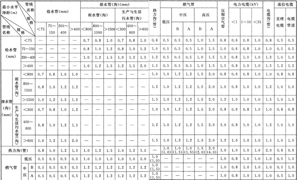 4 表列數(shù)據(jù)系按給水管在污水管(溝)上方制定的。生活飲用水給水管與污水管(溝)之間的凈距應(yīng)按本表數(shù)據(jù)增加50%;生產(chǎn)廢水管與雨水管(溝)和給水管之間的凈距可減少20%,和通信電纜、電力電纜之間的凈距可減少20%,但不得小于0.5m。
