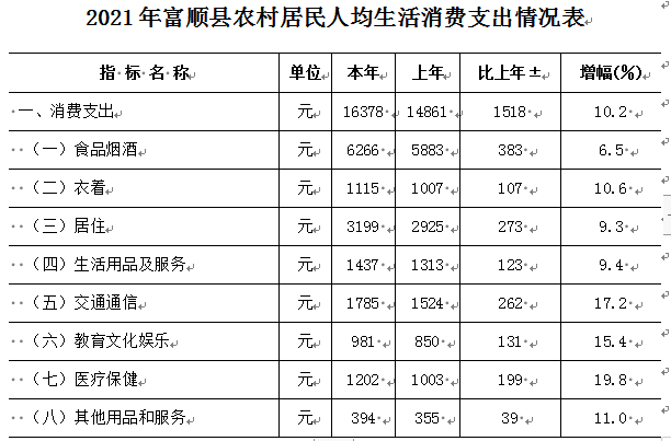 經(jīng)國家統(tǒng)計局富順調(diào)查隊調(diào)查,國家統(tǒng)計局四川調(diào)查總隊核定,2021年,富順縣農(nóng)村居民人均生活消費支出16378元,比上年同期增加1518元,同比增長10.2%;增速比上年同期增長7.3個百分點,生活消費支出恢復性增長,基本回到疫情前增速水平;與2019年相比,兩年平均增長6.7%。從消費結構來看,八大類消費全面增長。其中,醫(yī)療保健、交通通信、教育文化娛樂支出增速排前三位,分別增長19.8%、17.2%、15.4%;食品煙酒、居住、生活用品及服務支出增速居后三位,分別增長6.5%、9.3%、9.4%。(詳見下表)