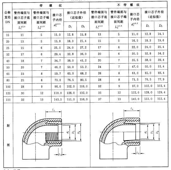 襯塑管件接口芯子尺寸應(yīng)符合表2規(guī)定。