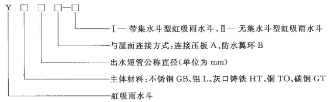 示例;YGB50A I表示不銹鋼斗體、出水短管公稱直徑50 mm、用連接壓板與屋面密封的帶集水斗型虹吸雨水斗。