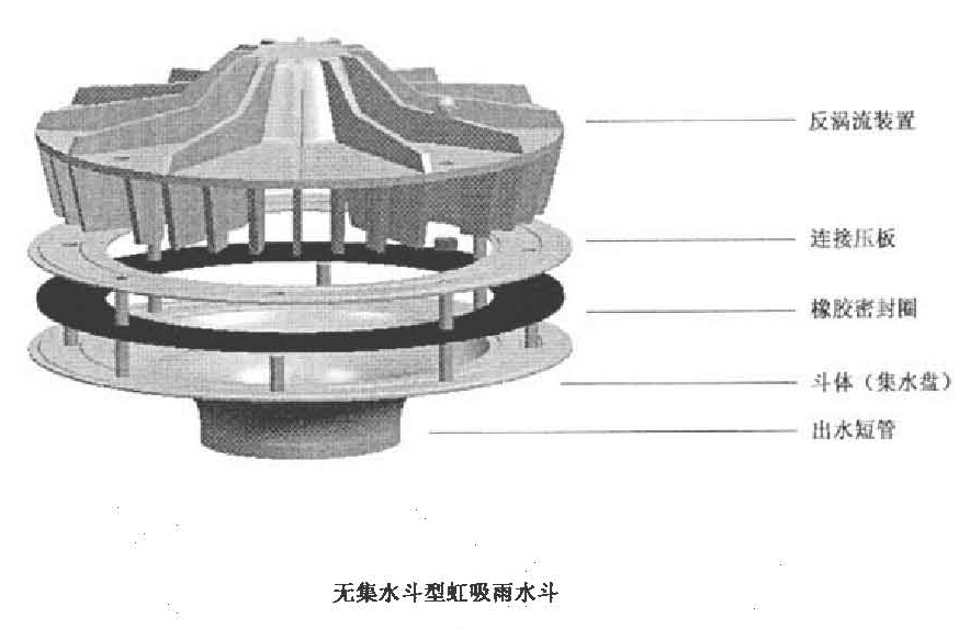 虹吸雨水斗斗體部件為集水斗,一般斗深大于60mm,設(shè)在屋面防水層下或屋面構(gòu)造層內(nèi),反渦流裝置設(shè)在集水斗中。