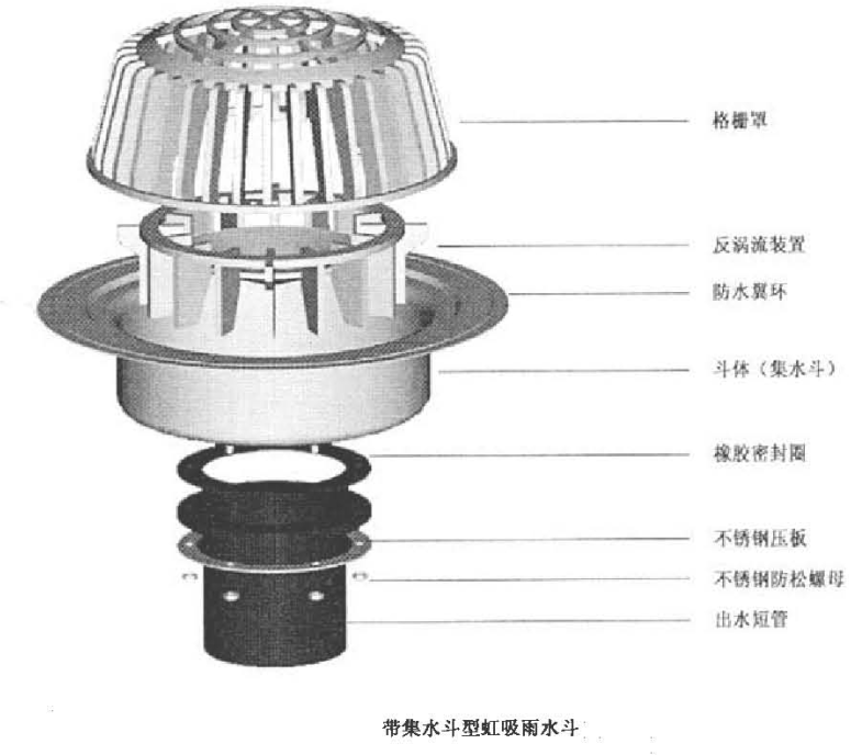 虹吸雨水斗的主體部件,通常是帶有防水翼環(huán)或法蘭盤的圓形集水斗或集水盤。下部裝有出水短管,集水斗內(nèi)或集水盤上設(shè)反渦流裝置,上部裝有格柵罩。