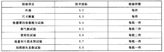 生產(chǎn)的每批產(chǎn)品不論數(shù)量多少,均應進行檢驗。按照GB/T2828.1的要求,從每批虹吸雨水斗產(chǎn)品中任意抽取樣式,按表1所列檢驗項目進行檢驗。如有一次不符合本標準要求,則需從該批中另取雙倍樣式進行復驗。若復驗結(jié)果扔不合格,則判斷該批產(chǎn)品為不合格,不得出廠。