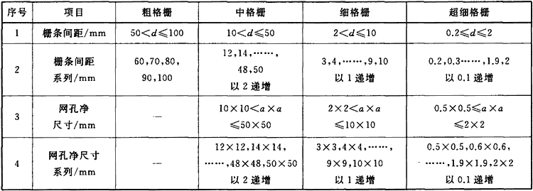 表3 柵條間距及網(wǎng)孔凈尺寸系列表