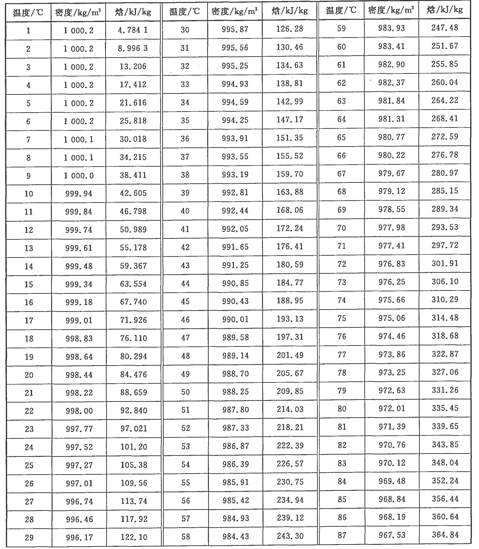 A.1 當(dāng)工作壓力小于或等于1.0 MPa時,水的密度和焓值采用表A.1的數(shù)據(jù)。
