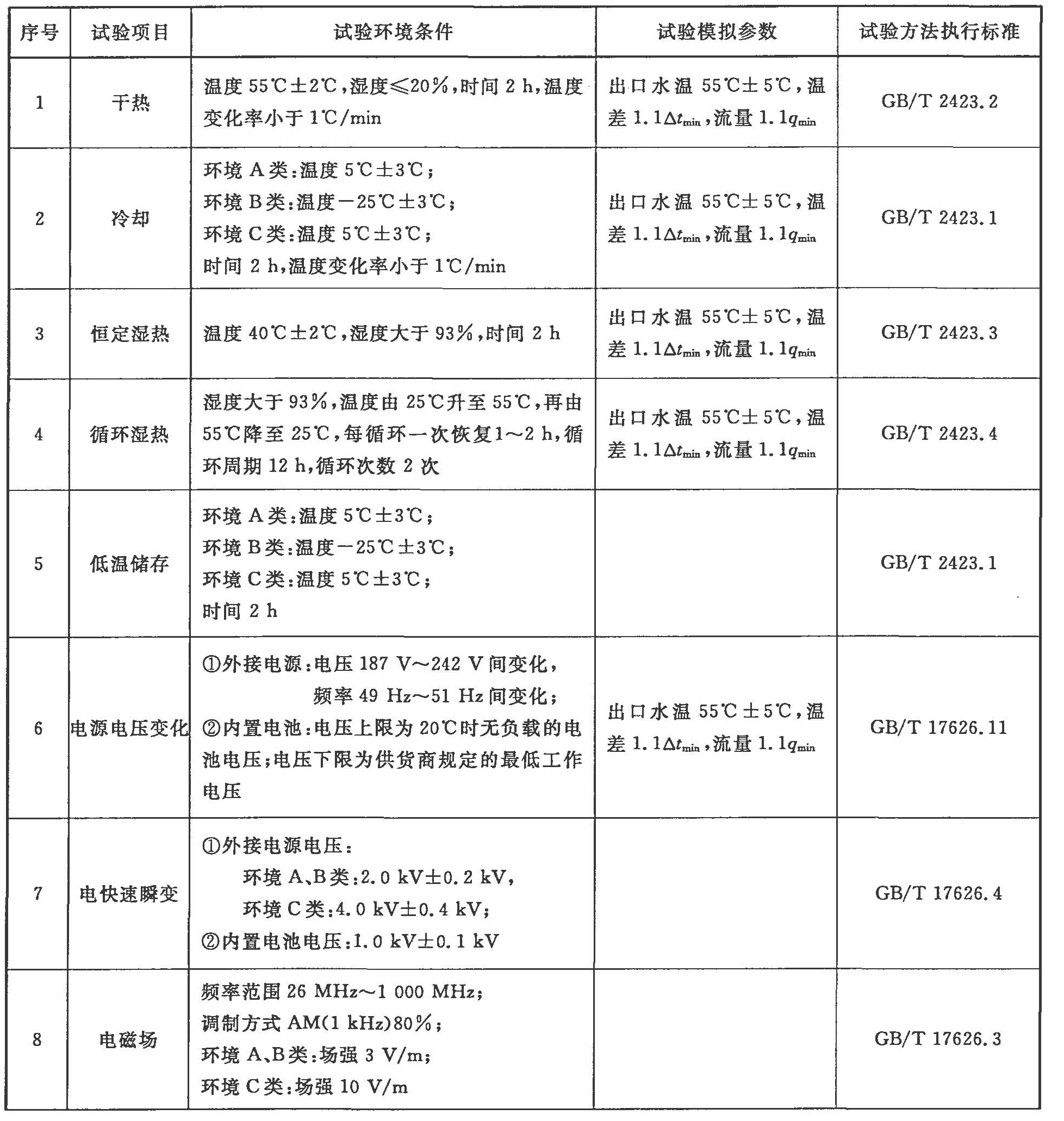 電氣環(huán)境試驗按表4的規(guī)定及相關(guān)標(biāo)準(zhǔn)執(zhí)行,其結(jié)果應(yīng)符合本標(biāo)準(zhǔn)5.12的規(guī)定。