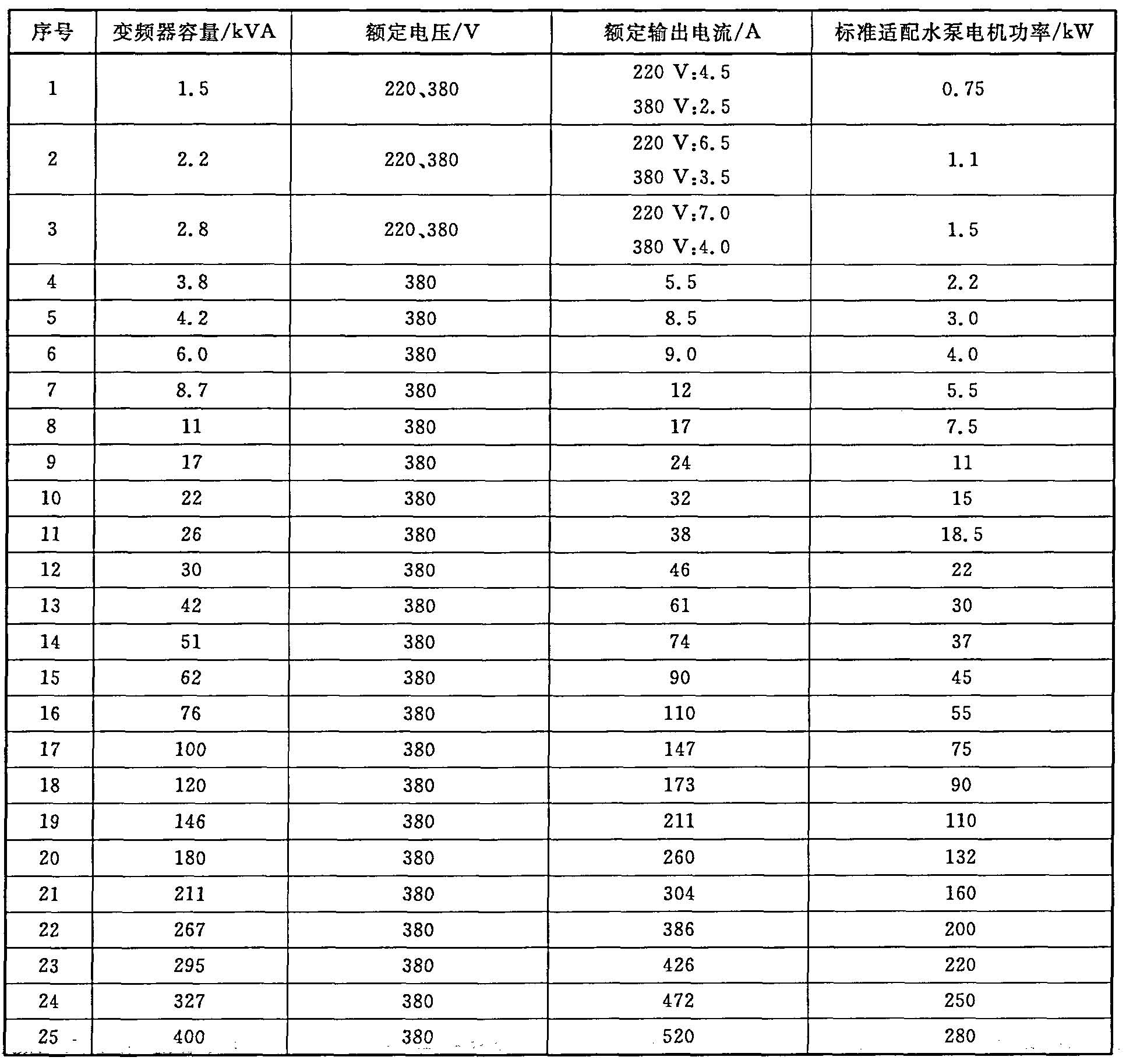 A.3 變頻器的額定電壓應(yīng)與水泵電機的額定電壓相符。變頻器的額定輸出電流應(yīng)與水泵電機的最大電流相符,且不允許電流連續(xù)流過值超過變頻器的額定輸出電流;當(dāng)用于潛水泵電機時,變頻器的額定輸出電流應(yīng)放大一檔。
