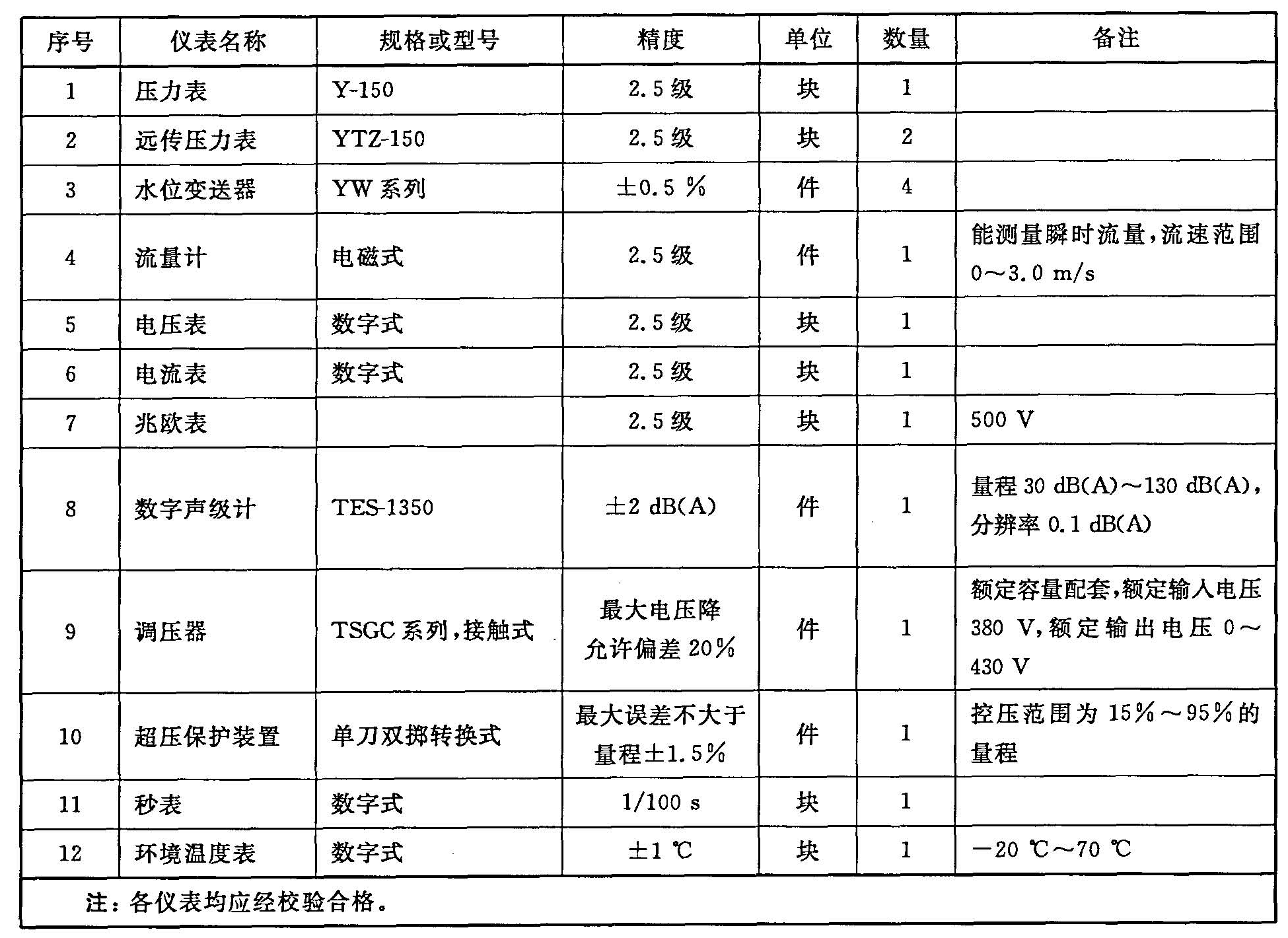 C.1 設(shè)備試驗所用儀表參見表C.1。