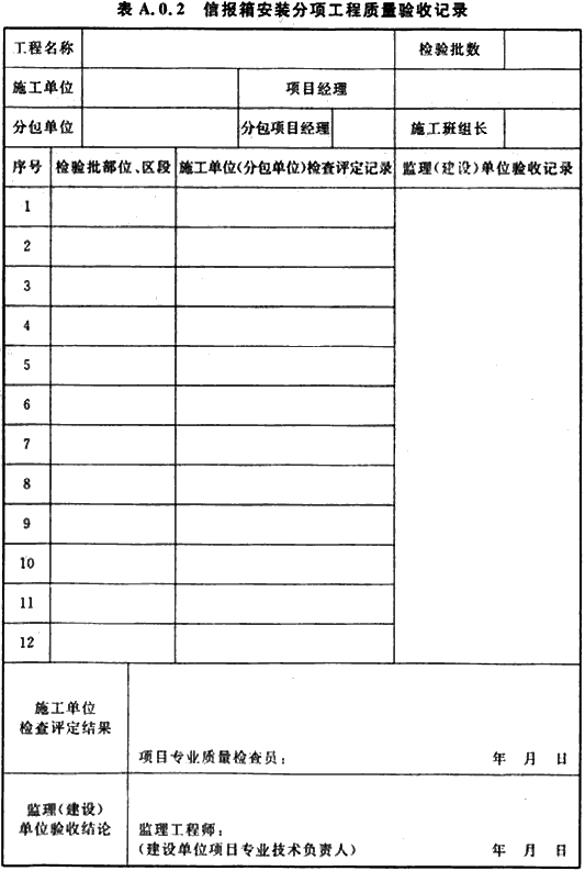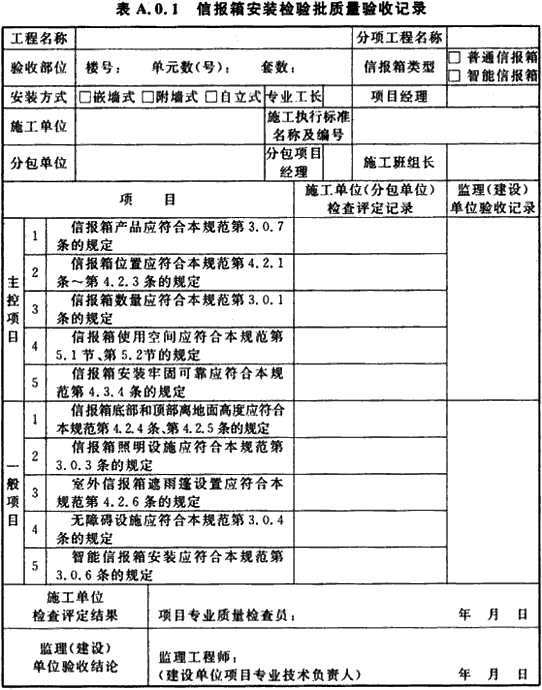 A.0.1 信報箱安裝檢驗批質(zhì)量驗收記錄應(yīng)按表A. 0.1填寫。