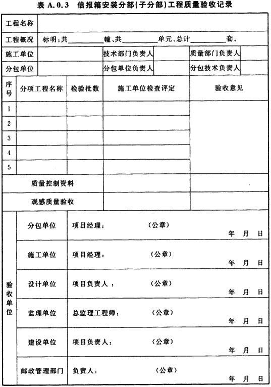 A.0.3 信報箱安裝分部(子分部)工程質(zhì)量驗收記錄應(yīng)按表A. 0.3填寫。
