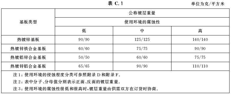 C.1 熱鍍基板在各類侵蝕性環(huán)境中推薦使用的最小公稱鍍層重量按符合C.1的規(guī)定。