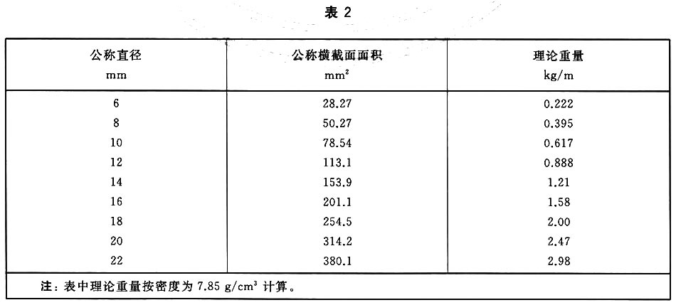 鋼筋的公稱橫截面面積與理論重量列于表2。