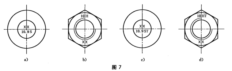 8.2 螺母應(yīng)在頂面用凹字制出性能等級(jí)和制造者的識(shí)別標(biāo)志[見圖7b]。其中,字母H表示鋼結(jié)構(gòu)用高強(qiáng)度大六角螺母;XX為制造者的識(shí)別標(biāo)志。