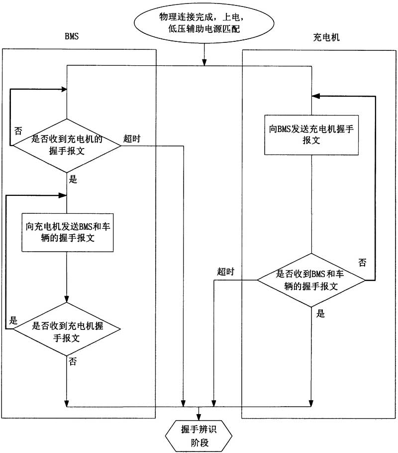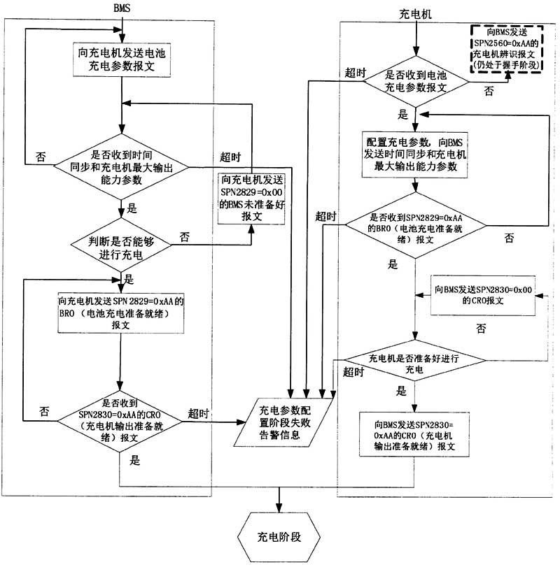 整個充電過程包括六個階段:物理連接完成、低壓輔助上電、充電握手階段、充電參數(shù)配置階段、充電階段和充電結束階段。在各個階段,充電機和BMS如果在規(guī)定的時間內沒有收到對方報文或沒有收到正確報文,即判定為超時(超時指在規(guī)定時間內沒有收到對方的完整數(shù)據包或正確數(shù)據包),超時時間除特殊規(guī)定外,均為5s。當出現(xiàn)超時后,BMS或充電機發(fā)送9.5規(guī)定的錯誤報文,并進入錯誤處理狀態(tài)。在對故障處理的過程中,根據故障的類別,分別進行不同的處理(參見附錄C)。在充電結束階段中,如果出現(xiàn)了故障,直接結束充電流程。報文的開始發(fā)送條件和中止發(fā)送條件參見附錄D。充電總體流程見圖1。