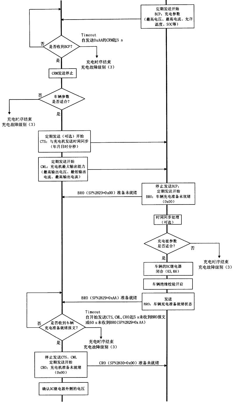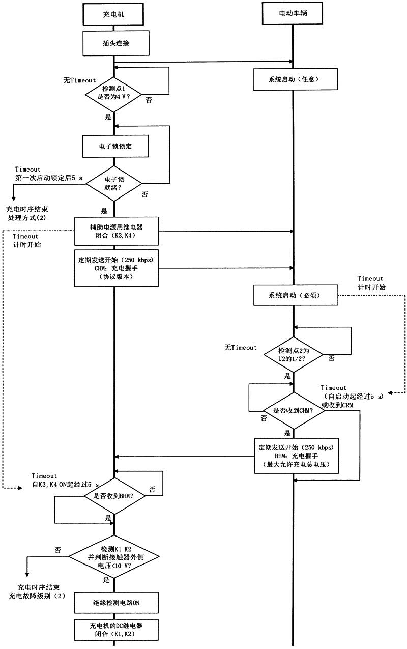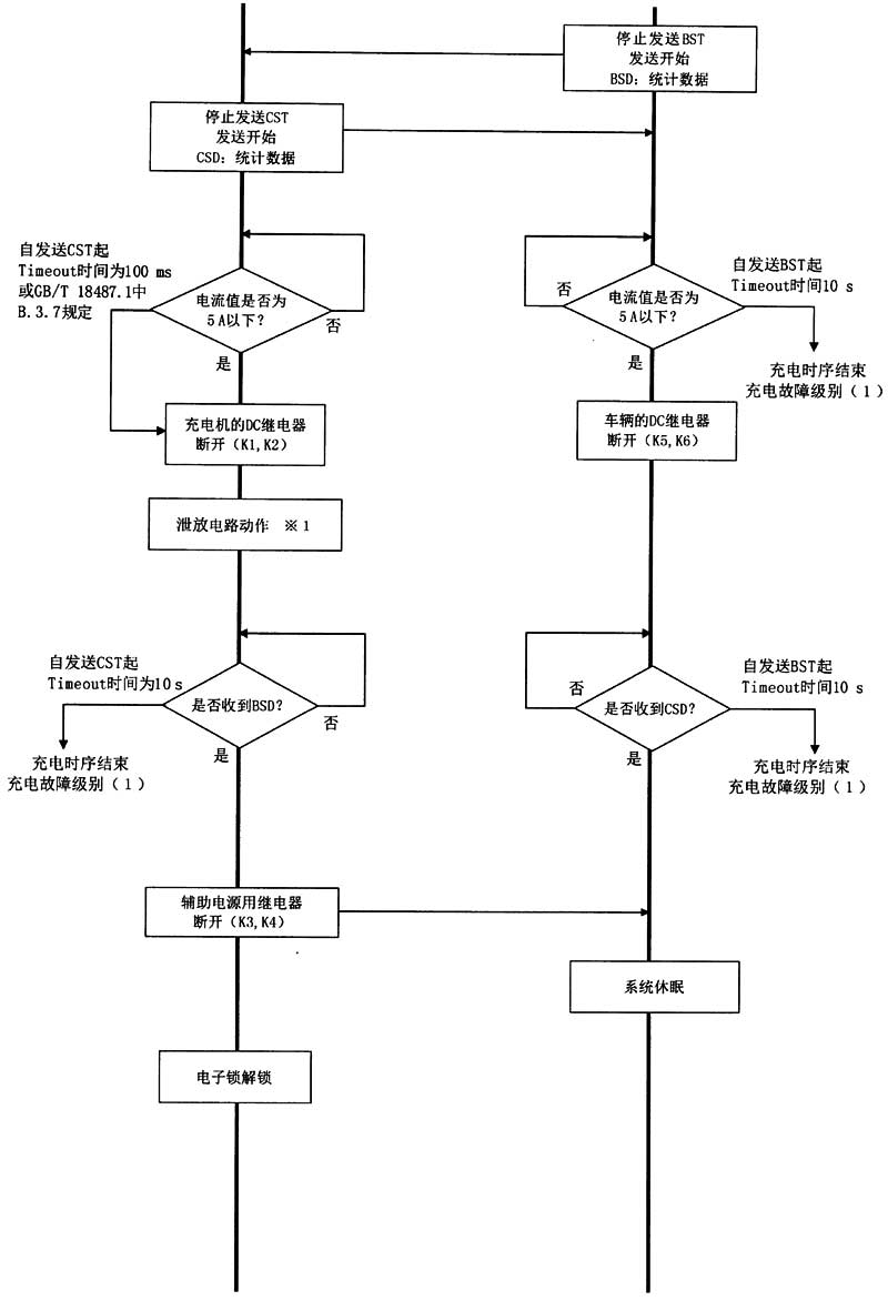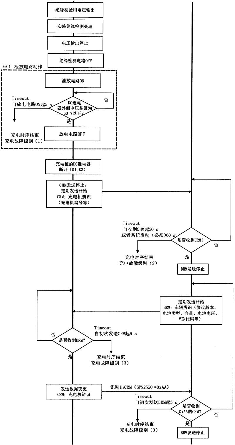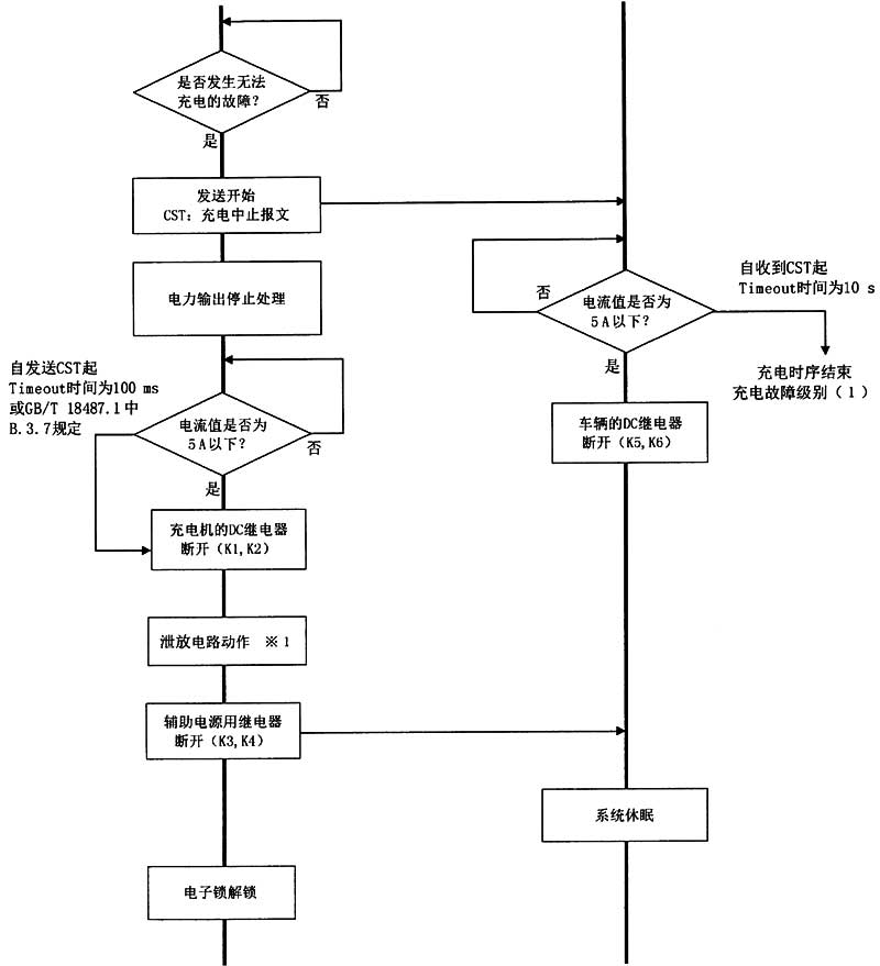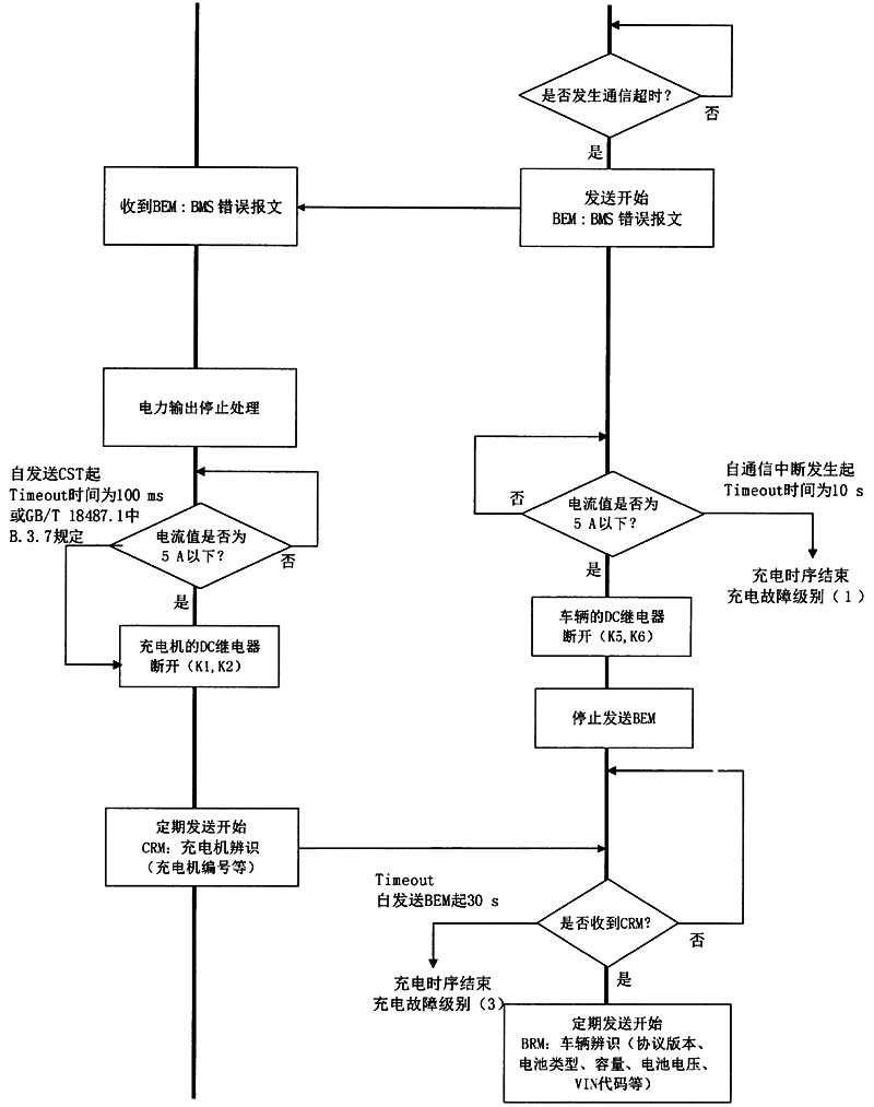 注2:當充電機檢測到充電故障時,立即發(fā)送CST(充電機中止充電)命令,同時充電機停機,停止CAN通信,切斷K1、K2、K3、K4等開關,根據故障類型進入相應的處理方式。在處理方式c)下,當充電機自檢到故障消除時,重新由充電機發(fā)起握手辨識階段的連接,進行充電。如果重新連接3次仍未成功,則按照處理方式b),需操作人員查看當前狀況并重新插拔充電連接器,嘗試再次充電。