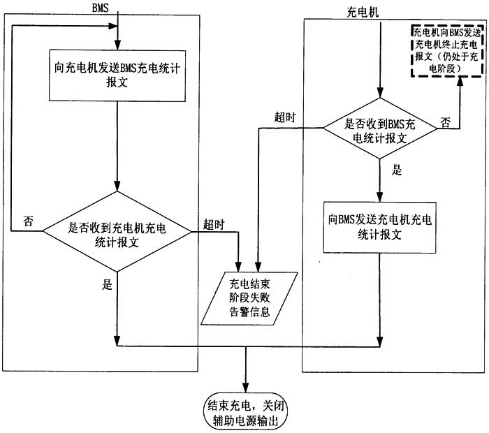 充電配置階段完成后,充電機和BMS進入充電階段。在整個充電階段,BMS實時向充電機發(fā)送電池充電需求,充電機根據電池充電需求來調整充電電壓和充電電流以保證充電過程正常進行。在充電過程中,充電機和BMS相互發(fā)送各自的充電狀態(tài)。除此之外,BMS根據要求向充電機發(fā)送動力蓄電池具體狀態(tài)信息及電壓、溫度等信息。BMV,BMT,BSP為可選報告,充電機不對其進行報文超時判定。