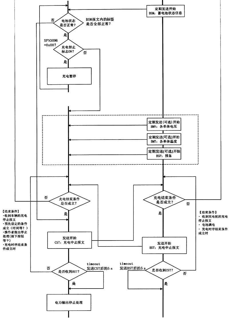 注1:BMS檢測到故障后,根據故障程度,選擇在BSM(動力蓄電池狀態(tài)信息)報文或BST(BMS中止充電)報文中提供停止充電信息,使充電機停機,進入處理方式b);或是將BSM報文中SPN3090~SPN3095均置為00(電池狀態(tài)正常),且SPN3096置為00(禁止充電),使充電機暫停輸出電流,此時BMS和充電機進行正常通信,直到等待BMS發(fā)送的BSM報文中SPN3096為01(允許充電)后,重新允許充電機電流輸出,如果等待時間超過10min,充電機中止充電,并保存中止充電原因。