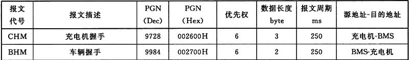 充電握手階段分為握手啟動階段和握手辨識階段,當充電機和BMS物理連接完成并上電后,開啟低壓輔助電源,進入握手啟動階段發(fā)送握手報文,再進行絕緣監(jiān)測。絕緣監(jiān)測結束后進入握手辨識階段,雙方發(fā)送辨識報文,確定電池和充電機的必要信息。CHM報文和BHM報文是為產品兼容的新增報文,用于在握手啟動階段充電機和BMS判斷雙方使用的標準版本。典型的充電工作狀態(tài)轉換參見圖A.1和圖A.2,充電時序詳見GB/T 18487.1。充電握手階段報文應符合表3的要求。