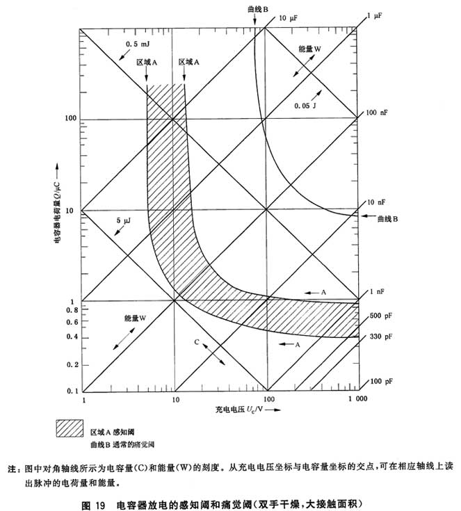 這些閾值取決于電極的形狀、脈沖的電荷量及其電流峰值。圖19表示人用干燥的手握住大電極時(shí),隨電容器電荷量和充電電壓而變的感知閾和痛覺(jué)閾。
