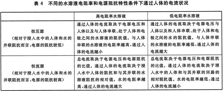 表4定性地說(shuō)明了不同的水溶液電阻率(相對(duì)于浸入水中人體的電阻率)和電源阻抗特性(相對(duì)于水溶液和浸入水中人體的阻抗)條件下通過(guò)人體的電流狀況。