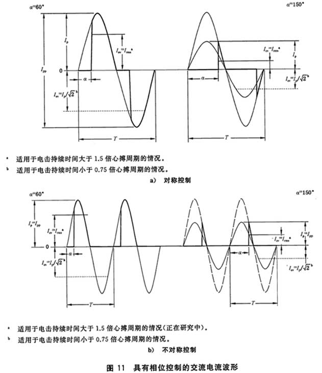 此類電流在產(chǎn)生感覺(jué)或妨礙擺脫方面的效應(yīng)與具有相同峰值Ip的純交流電流的效應(yīng)大致相同。相位控制角大于120°時(shí),峰值電流隨著電流持續(xù)時(shí)間的減少而增大。