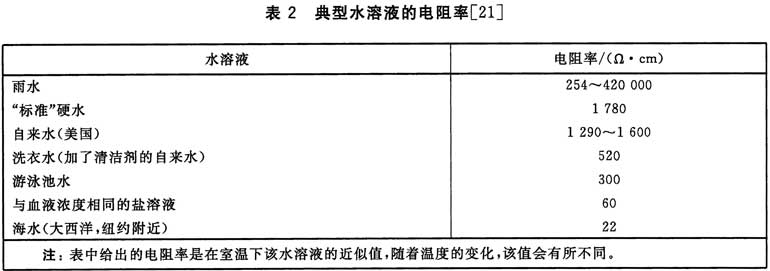 純水本身是非導(dǎo)電體,但當(dāng)有鹽類等雜質(zhì)加入時(shí),水溶液的電阻率會(huì)大幅降低。表2給出了典型水溶液的電阻率值,人體可能部分或全部浸入這些水溶液中。