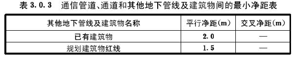 3.0.3通信管道與通道應(yīng)避免與燃氣管道、高壓電力電纜在道路同側(cè)建設(shè),不可避免時,通信管道、通道與其他地下管線及建筑物間的最小凈距,應(yīng)符合表3.0.3的規(guī)定。