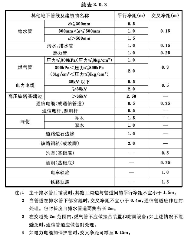 2 與其他地下管線交越時的間距不符合表3.0.3的規(guī)定時。
