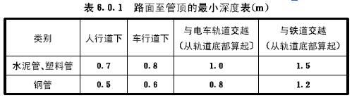 6.0.1通信管道的埋設(shè)深度管頂至路面不應(yīng)低于表6.0.1的要求。當(dāng)達不到要求時,應(yīng)采用混凝土包封或鋼管保護。
