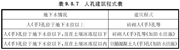 9.0.7根據(jù)地下水位情況,人(手)孔的建筑程式可按表9.0.7的規(guī)定確定。