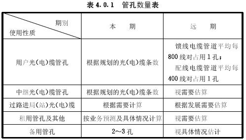 4.0.1管孔容量應(yīng)按業(yè)務(wù)預(yù)測及各運營商的具體情況計算,各段管孔數(shù)可按表4.0.1的規(guī)定估算。