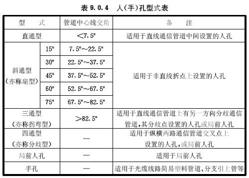9.0.3人孔型式應(yīng)根據(jù)終期管群容量大小確定。綜合目前通信管道的建設(shè)和使用情況,人(手)孔型號的選擇宜按下列孔數(shù)選擇:
