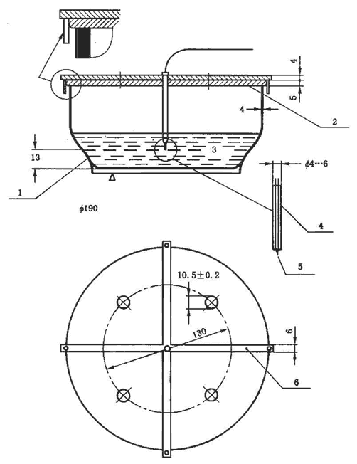 在附錄B所示的瓷碗中,注入0.5L沸水。攪動(dòng)沸水直至其冷卻至80℃。之后將碗用粘附有金屬十字梁的橡膠蓋蓋上,將一熱電偶插入碗中,其結(jié)合點(diǎn)距碗底部20 mm。