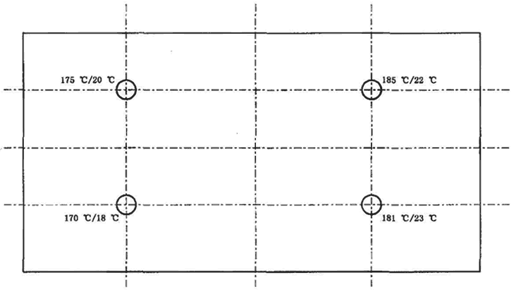 將保溫表面平均劃分為 4 個(gè)區(qū)域,測(cè)量每一個(gè)區(qū)域的幾何中心點(diǎn)溫度,以攝氏度為單位表示。