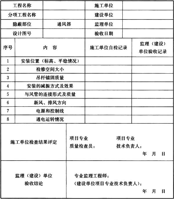 B.0.1 通風(fēng)器吊裝隱蔽工程檢查驗(yàn)收記錄應(yīng)符合表B.0.1 的規(guī)定。