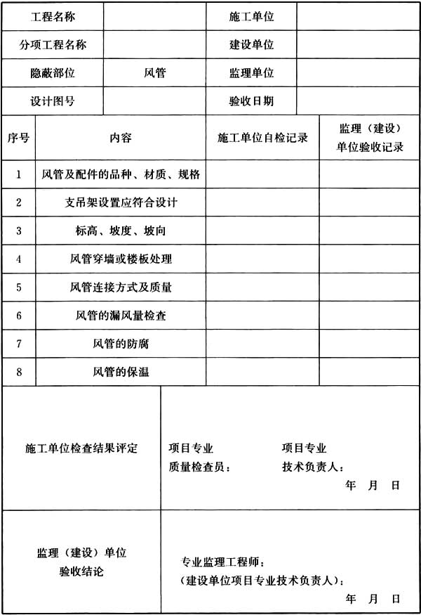 表 B.0.2 風(fēng)管隱蔽工程檢查驗(yàn)收記錄