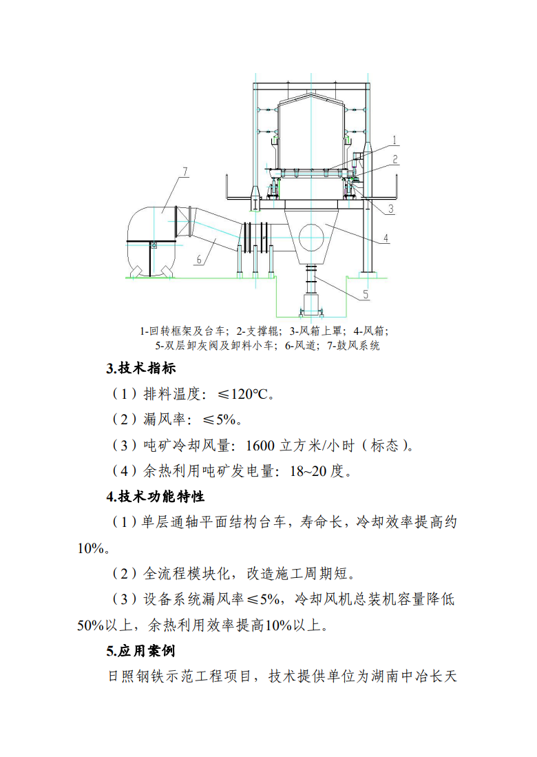 轉(zhuǎn)臂式液密封環(huán)冷機(jī),以高剛度模塊化回轉(zhuǎn)體單元為核心運(yùn)行部件,以水作為密封介質(zhì),并配備完善的運(yùn)行安全檢測及控制系統(tǒng),解決了傳統(tǒng)環(huán)冷機(jī)運(yùn)行跑偏及密封效果差造成的漏風(fēng)漏料問題。技術(shù)提供單位為湖南中冶長天重工科技有限公司。在日照鋼鐵示范工程項(xiàng)目中,利用轉(zhuǎn)臂式液密封環(huán)冷機(jī)替代原有傳統(tǒng)環(huán)冷機(jī),系統(tǒng)運(yùn)行穩(wěn)定,年節(jié)約標(biāo)準(zhǔn)煤1.17萬噸,年減排CO23.24萬噸。
