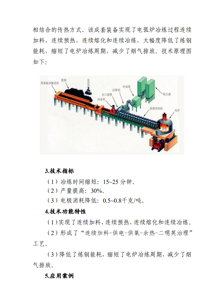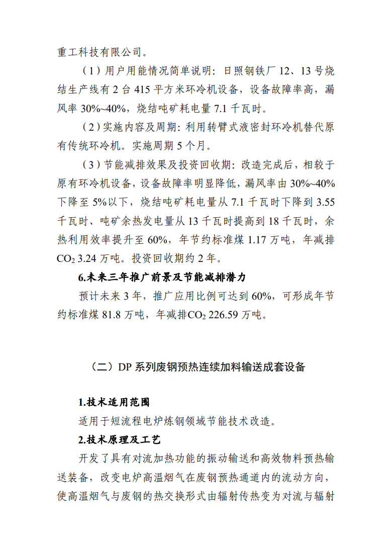 DP系列廢鋼預(yù)熱連續(xù)加料輸送成套設(shè)備,開發(fā)了具有對(duì)流加熱功能的振動(dòng)輸送和高效物料預(yù)熱輸送裝備,改變電爐高溫?zé)煔庠趶U鋼預(yù)熱通道內(nèi)的流動(dòng)方向,使高溫?zé)煔馀c廢鋼的熱交換形式由輻射傳熱變?yōu)閷?duì)流與輻射相結(jié)合的傳熱方式,降低了煉鋼能耗,縮短了電爐冶煉周期,減少了煙氣排放。技術(shù)提供單位為河南太行全利重工股份有限公司。在西寧特殊鋼股份有限公司改造示范項(xiàng)目中,在原設(shè)備基礎(chǔ)上新建DP系列廢鋼預(yù)熱連續(xù)加料輸送成套設(shè)備,年節(jié)約標(biāo)準(zhǔn)煤2.64萬噸,年減排CO27.31萬噸。