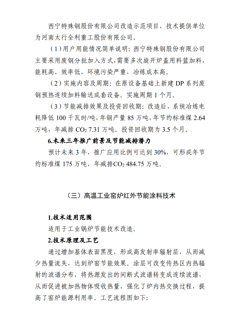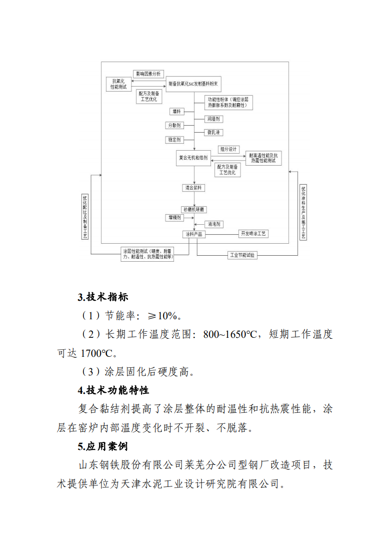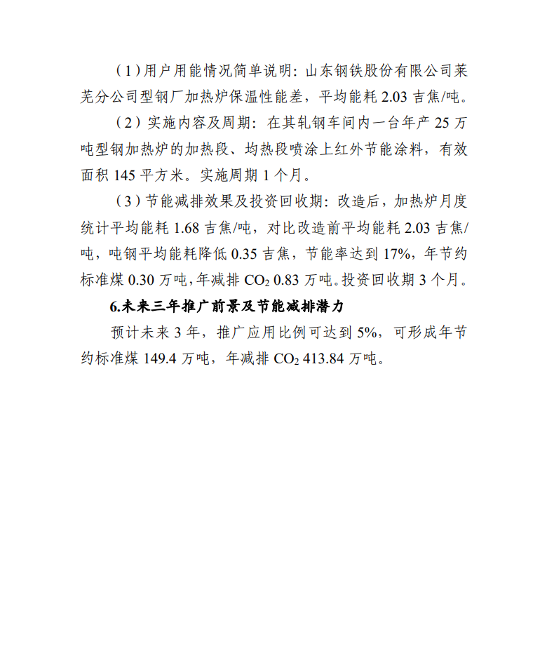 高溫工業(yè)窯爐紅外節(jié)能涂料技術(shù),通過增加基體表面黑度,形成高發(fā)射率輻射層,從而減少熱量流失,達(dá)到爐窯節(jié)能效果。技術(shù)提供單位為天津水泥工業(yè)設(shè)計(jì)研究院有限公司。在山東鋼鐵股份有限公司萊蕪分公司型鋼廠改造項(xiàng)目中,其軋鋼車間內(nèi)一臺(tái)年產(chǎn)25萬噸型鋼加熱爐的加熱段、均熱段噴涂上紅外節(jié)能涂料,有效面積145平方米,年節(jié)約標(biāo)準(zhǔn)煤0.30萬噸,年減排CO20.83萬噸。