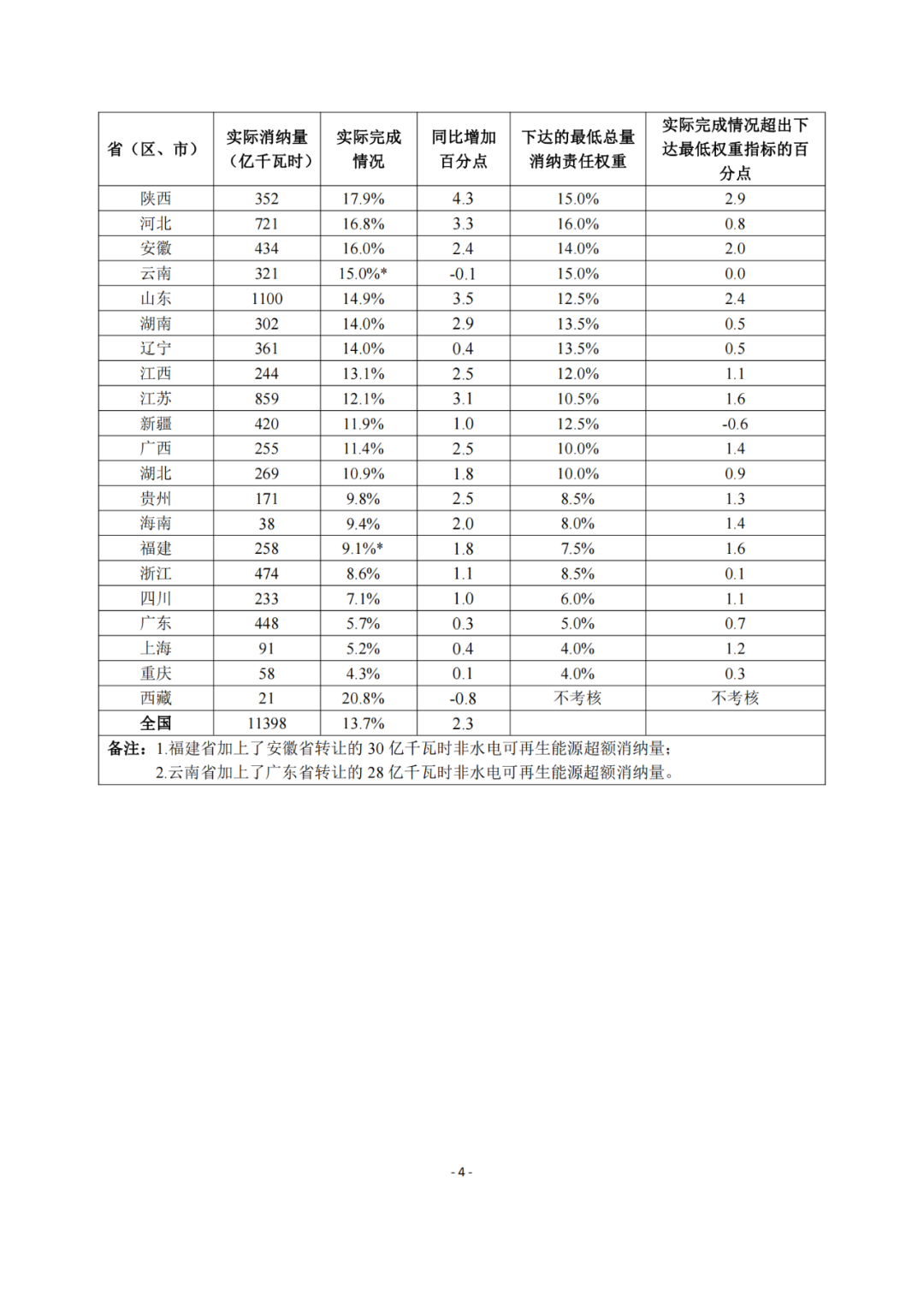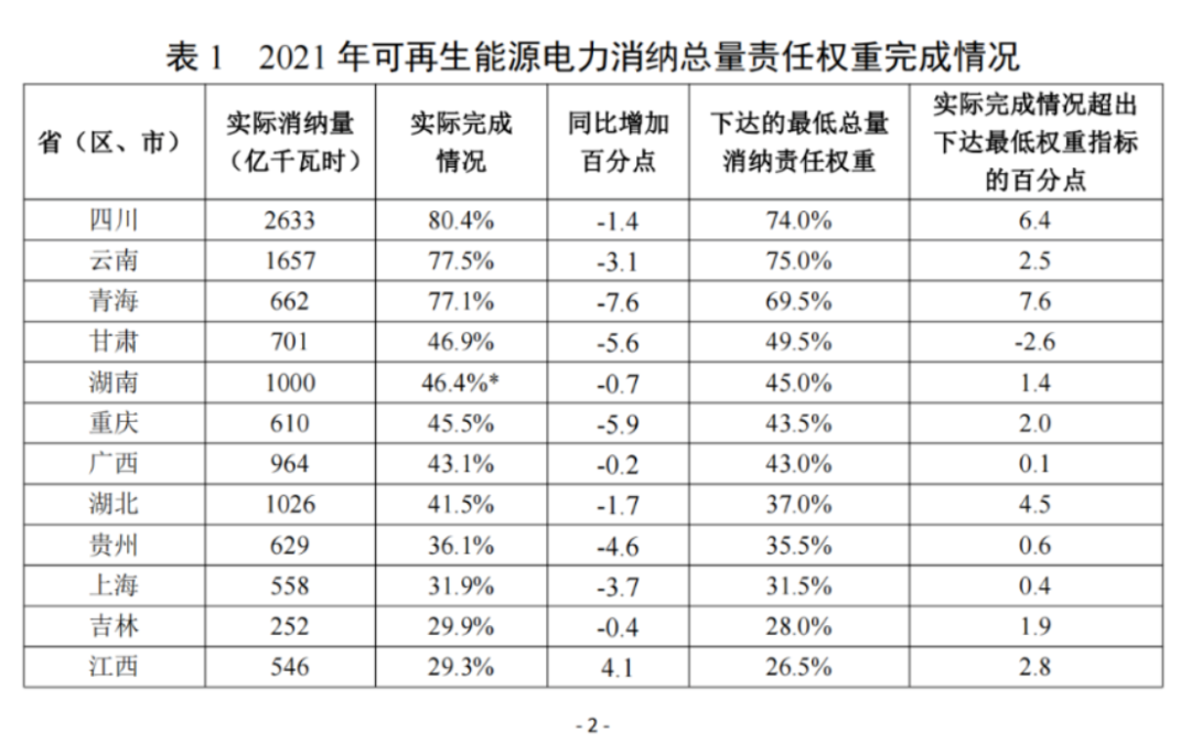 二、各?。▍^(qū)、市)可再生能源電力消納責(zé)任權(quán)重完成情況