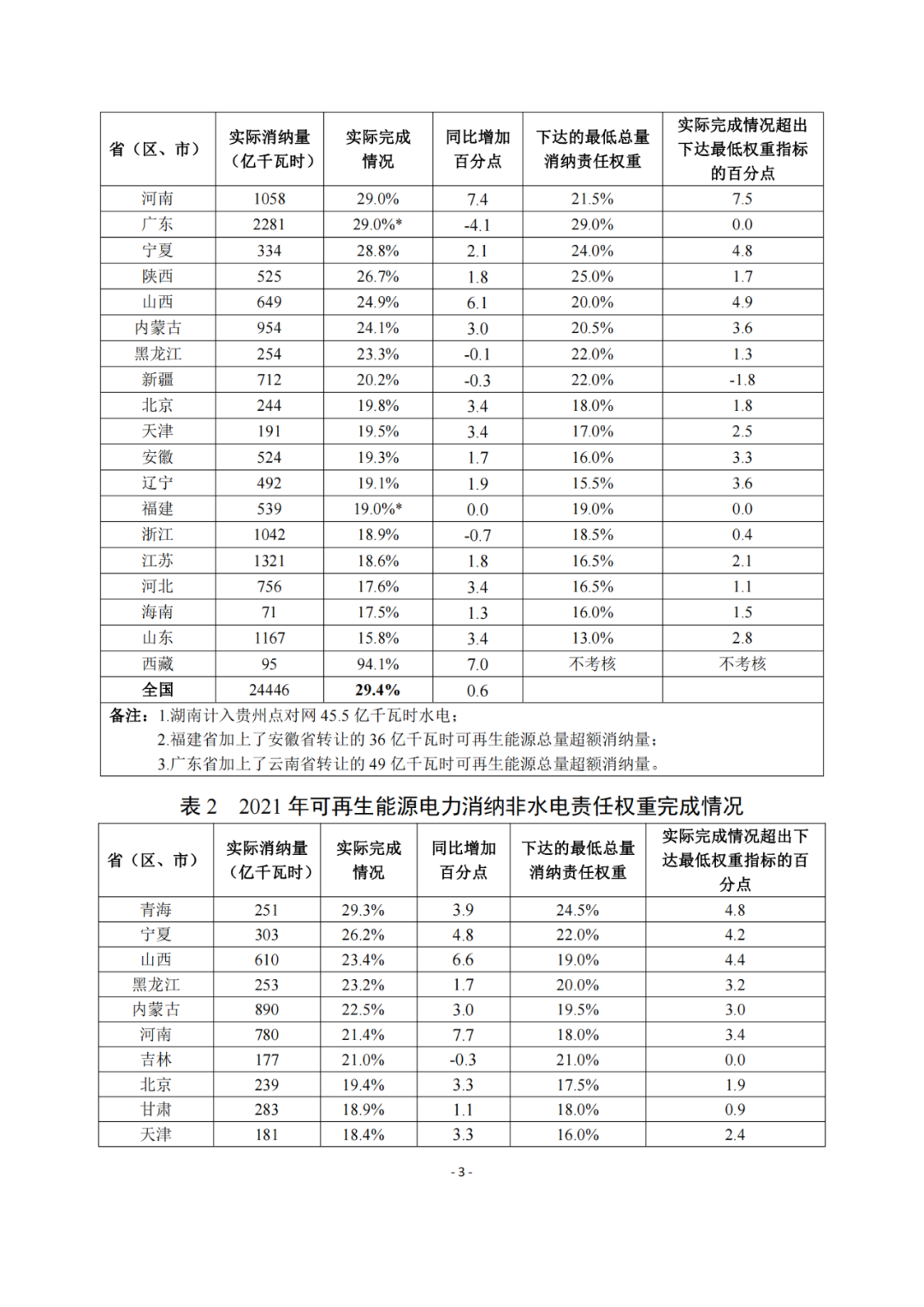 根據(jù)《國家發(fā)展改革委 國家能源局關(guān)于2021年可再生能源電力消納責(zé)任權(quán)重及有關(guān)事項(xiàng)的通知》(發(fā)改能源〔2021〕704號)公布的2021年各?。ㄗ灾螀^(qū)、直轄市)可再生能源電力消納責(zé)任權(quán)重,綜合考慮各省本地生產(chǎn)、本地利用以及外來電力消納情況,經(jīng)核算,除西藏免除考核外,全國28個(gè)?。ㄗ灾螀^(qū)、直轄市)完成了國家能源主管部門下達(dá)的最低總量消納責(zé)任權(quán)重,甘肅和新疆可再生能源電力總量消納實(shí)際完成情況較最低消納責(zé)任權(quán)重分別低2.6個(gè)和1.8個(gè)百分點(diǎn);全國29個(gè)?。ㄗ灾螀^(qū)、直轄市)完成了國家能源主管部門下達(dá)的最低非水電消納責(zé)任權(quán)重,新疆非水電可再生能源電力消納實(shí)際完成情況較最低消納責(zé)任權(quán)重低0.6個(gè)百分點(diǎn)。