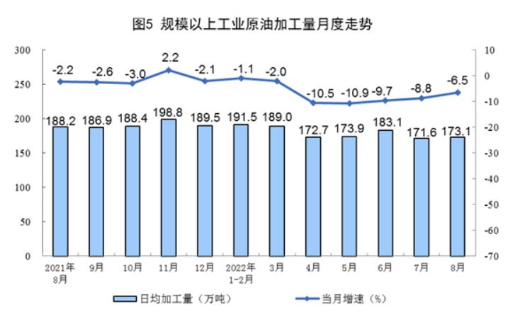 原油加工量降幅有所收窄。8月份,加工原油5366萬(wàn)噸,同比下降6.5%,降幅比上月收窄2.3個(gè)百分點(diǎn),日均加工173.1萬(wàn)噸。1—8月份,加工原油43489萬(wàn)噸,同比下降6.3%。