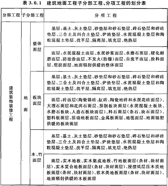 3.0.23 建筑地面工程的施工質(zhì)量驗收應(yīng)在建筑施工企業(yè)自檢合格的基礎(chǔ)上,由監(jiān)理單位或建設(shè)單位組織有關(guān)單位對分項工程、子分部工程進(jìn)行檢驗。