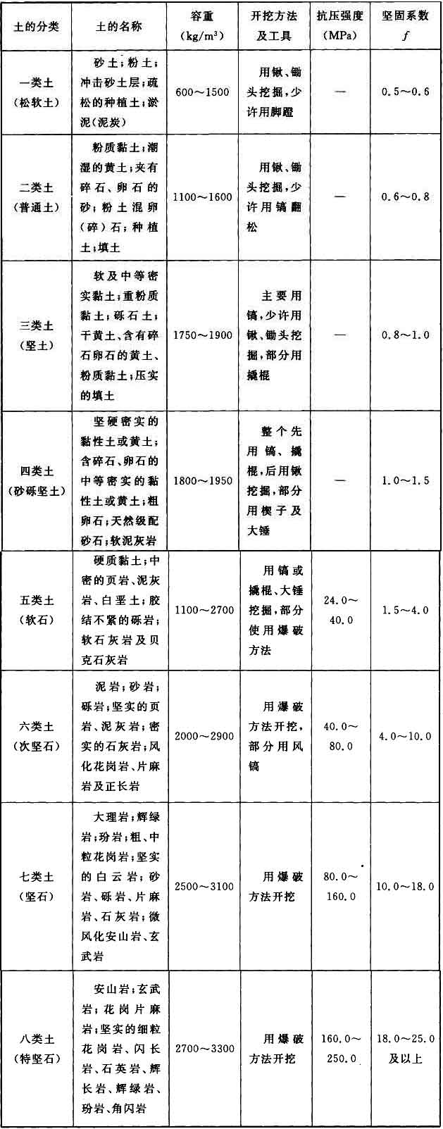 注:土壤及巖石施工中,按土堅實程度(開挖的難易程度)及使用工具,將土分為八類,一類土~四類土為一般土,五類土~八類土屬于巖石。