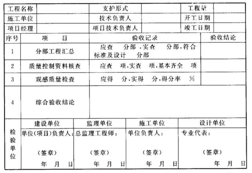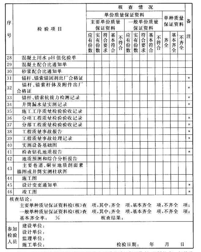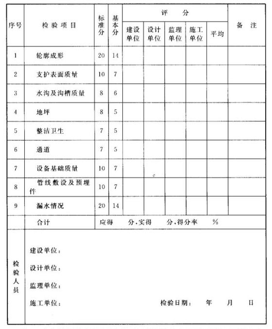 3 立井單位(或子單位)工程觀感質(zhì)量驗(yàn)收記錄表(表C.0.4-3)、斜井、巷道單位(或子單位)工程觀感質(zhì)量驗(yàn)收記錄表、(表C.0.4-4)、硐室單位(或子單位)工程觀感質(zhì)量驗(yàn)收記錄表(表C.0.4-5)、運(yùn)輸線路鋪軌單位(或子單位)工程觀感質(zhì)量驗(yàn)收記錄表(表C.0.4-6):應(yīng)由施工單位填寫,合計(jì)得分應(yīng)由監(jiān)理(或建設(shè))單位填寫,各單位參加驗(yàn)收人員應(yīng)簽字。