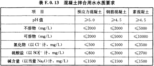 F.0.13 混凝土拌合用水水質應符合表F.0.13的規(guī)定。