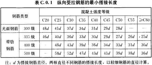 C.0.1 當縱向受拉鋼筋的綁扎搭接接頭面積百分率不大于25%時,其最小搭接長度應符合表C.0.1的規(guī)定。